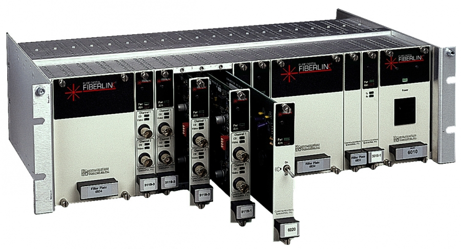 FiberLink® 6000A 19インチラックマウント型カードケージは、ファイバーリンク送信機、受信機、トランシーバのカードモジュールを20式取付けるスロットを提供します。(ファイバーリンク製品ガイドのスロットと電源を参照ください)